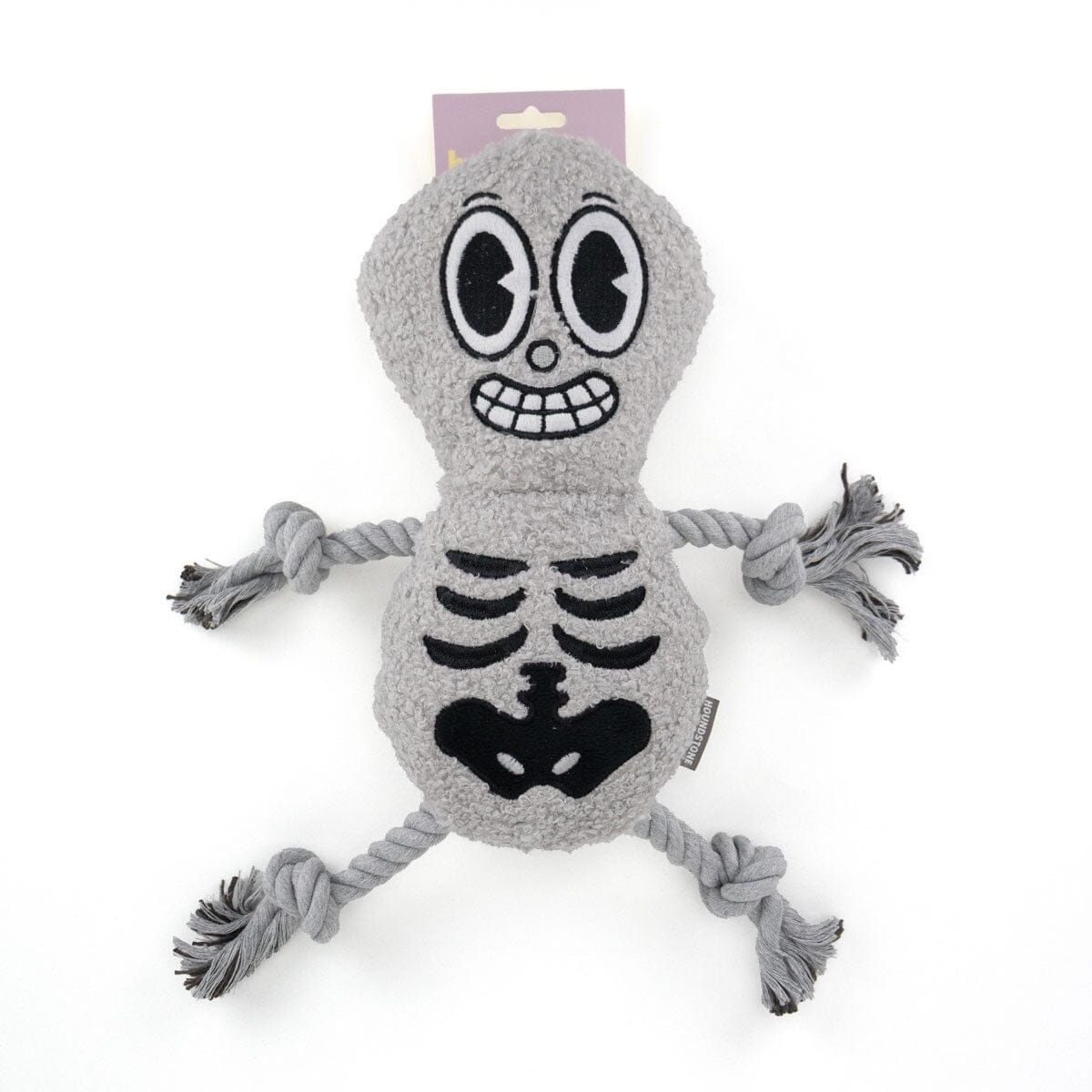 Houndstone’s Boneyard Buddy 2-Faced Skeleton Dog Toy is our spookiest interactive dog toy yet, and your pup won’t want to stop playing with it. Built for dogs of all personalities and sizes, Boneyard Buddy comes in two size options to fit pups from small to large. This toy features two fun faces: a smiling skeleton on one side and a grumpy one on the other. Inside the body, a squeaker adds extra excitement, while rope arms and legs bring durability and texture, making it perfect for tugging, shaking, and interactive play sessions. With its playful design and multi-feature play value, this toy easily earns its place among the best dog toys for year-round entertainment. At Houndstone, we believe that safety comes first. That’s why we use safe dyes and quality materials to ensure your dog’s playtime stays safe and joyful. While this toy is made with quality materials, no toy is completely indestructible, especially with enthusiastic chewers, so always keep an eye on your pup during playtime.