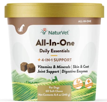 All-In-One provides nutritional support for healthy digestion, joints, skin, and coat, and immune system function. Prebiotic, probiotic, and digestive enzymes nourish the natural gut bacteria and balances the intestinal microflora. Bacillus coagulans probiotic contains a source of live (viable) naturally occurring microorganisms for digestive health.