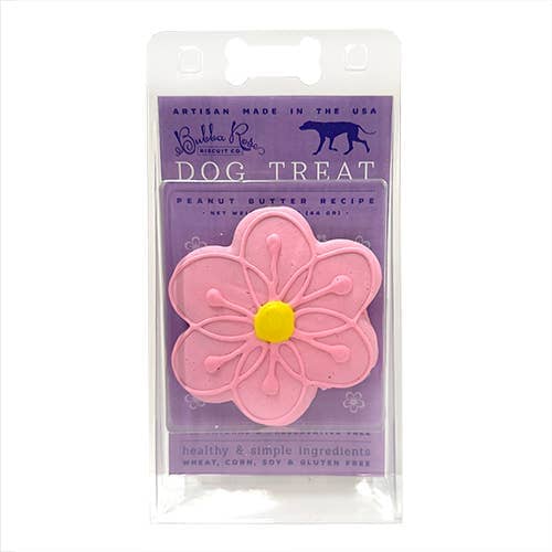 Brand new, large flower cookie, is a great addition to the Spring collection and also one of our bigger treats. Made from our fan favorite peanut butter treat recipe, they're sure to please.